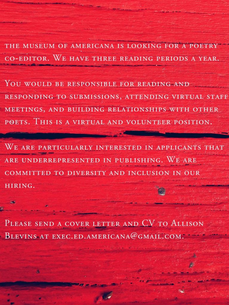 the museum of americana is seeking a new Poetry Co-Editor, responsible for reading and responding to submissions for three reading periods annually, attending virtual staff meetings, and building relationships with other publications and poets.