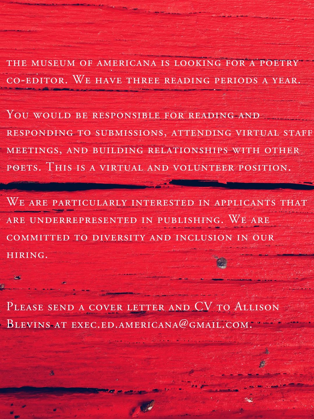 the museum of americana is seeking a new Poetry Co-Editor, responsible for reading and responding to submissions for three reading periods annually, attending virtual staff meetings, and building relationships with other publications and poets.