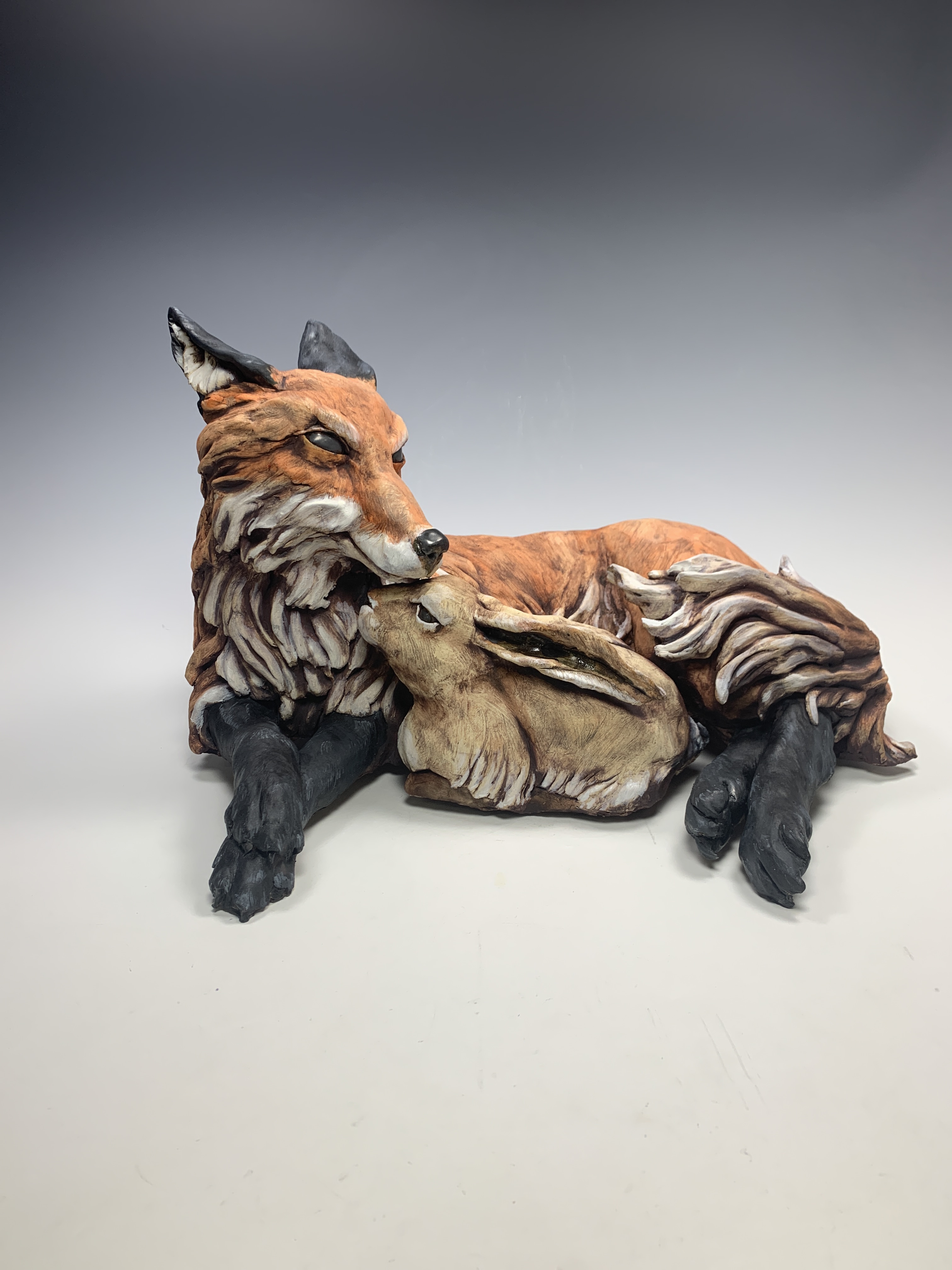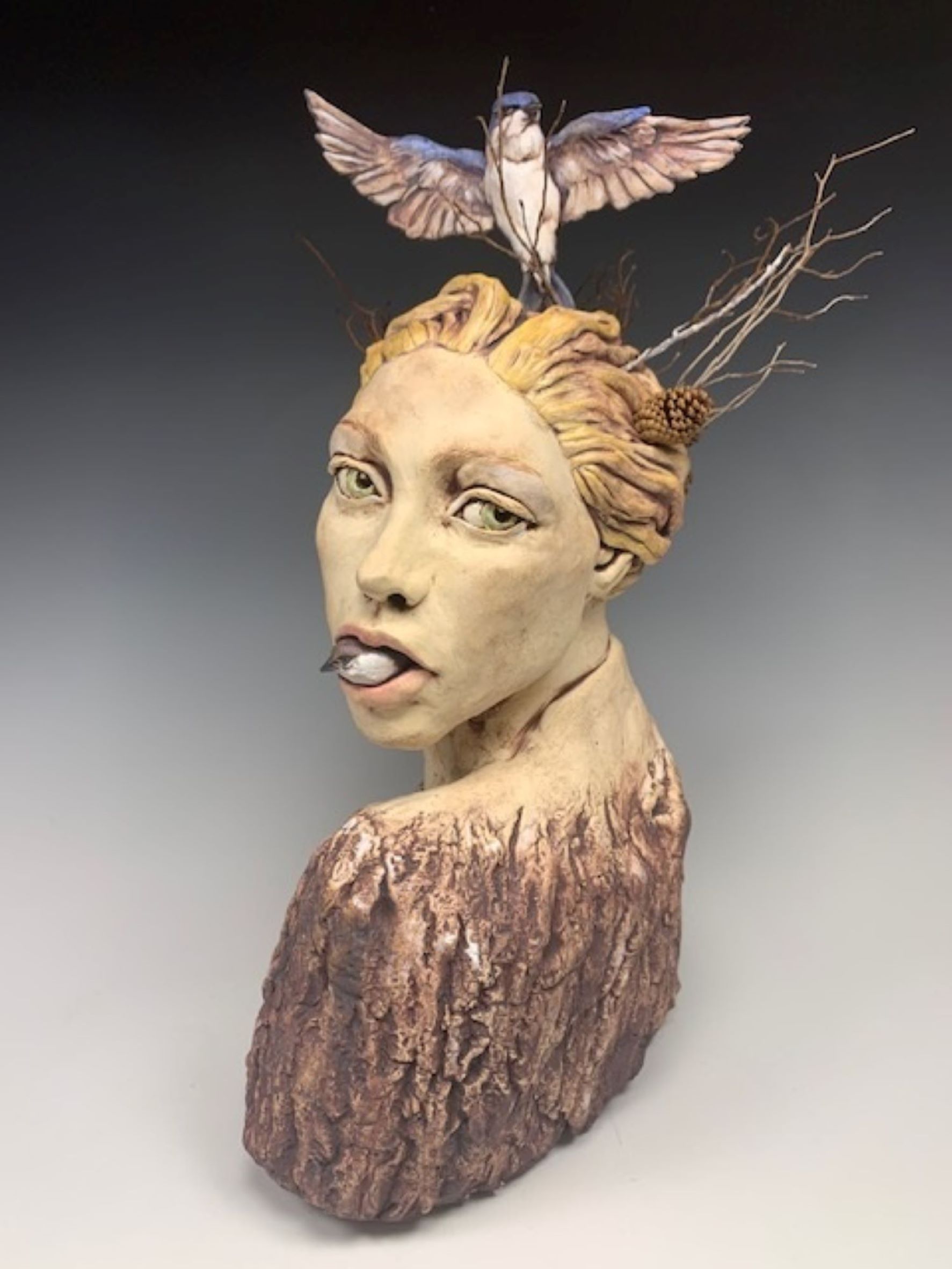 I tell a story in each of my pieces using symbolism in found materials that I incorporate into my work, whether it is from the subject’s natural surroundings or a component of the story. I use a method of using oxides during the final firing of my pieces to capture all the marks made in the creation of the piece. This makes my sculptures look like 3D drawings harkening back to my strong drawing roots.