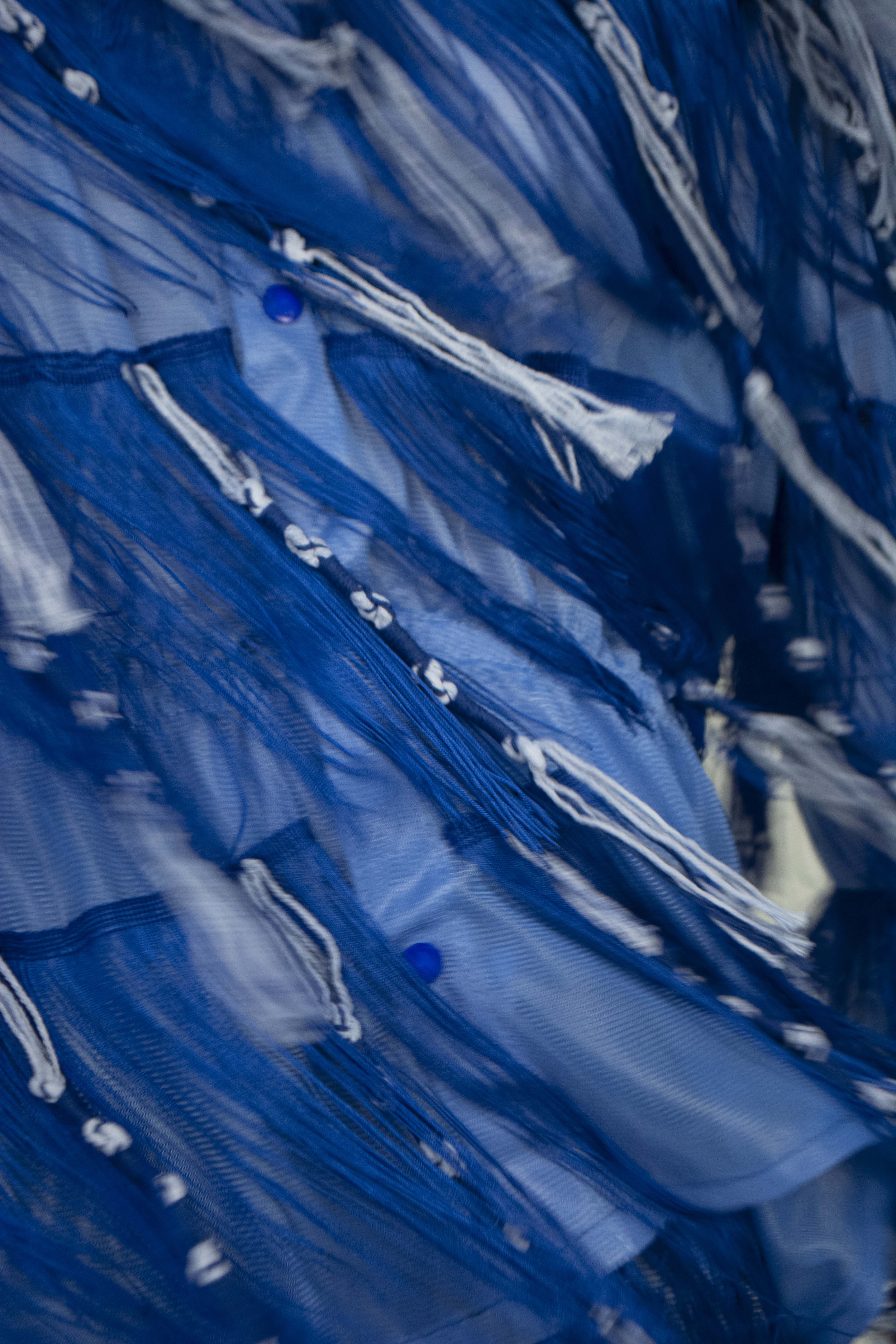 The Ghillie Suit pairs Western fringe with the knotted Jewish ritual fringe known as tzitzit. This pairing stems from the immigration story of Nudie Cohn, the tailor. Cohn, born Nuta Kotlyarenko, was an Eastern European Jew who fled Tsarist Russia. Cohn was able to reinvent himself in 1940’s Hollywood, CA. In this Golden Age of Hollywood, Cohn opened “Nudies of Hollywood” and defined the over-the-top Western aesthetic seen in his iconic designs for stars such as Elvis Presley and Elton John.