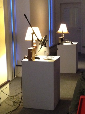 Set-up for Laying of Hands, an installation piece that amplifies and processes the sounds of audience members interacting with objects of nostalgia. Folding letters, flipping through photographs, and rewinding/advancing through tape-recorded memos create a sonic atmosphere to accompany live electric guitar and melodica improvisations and video playback.