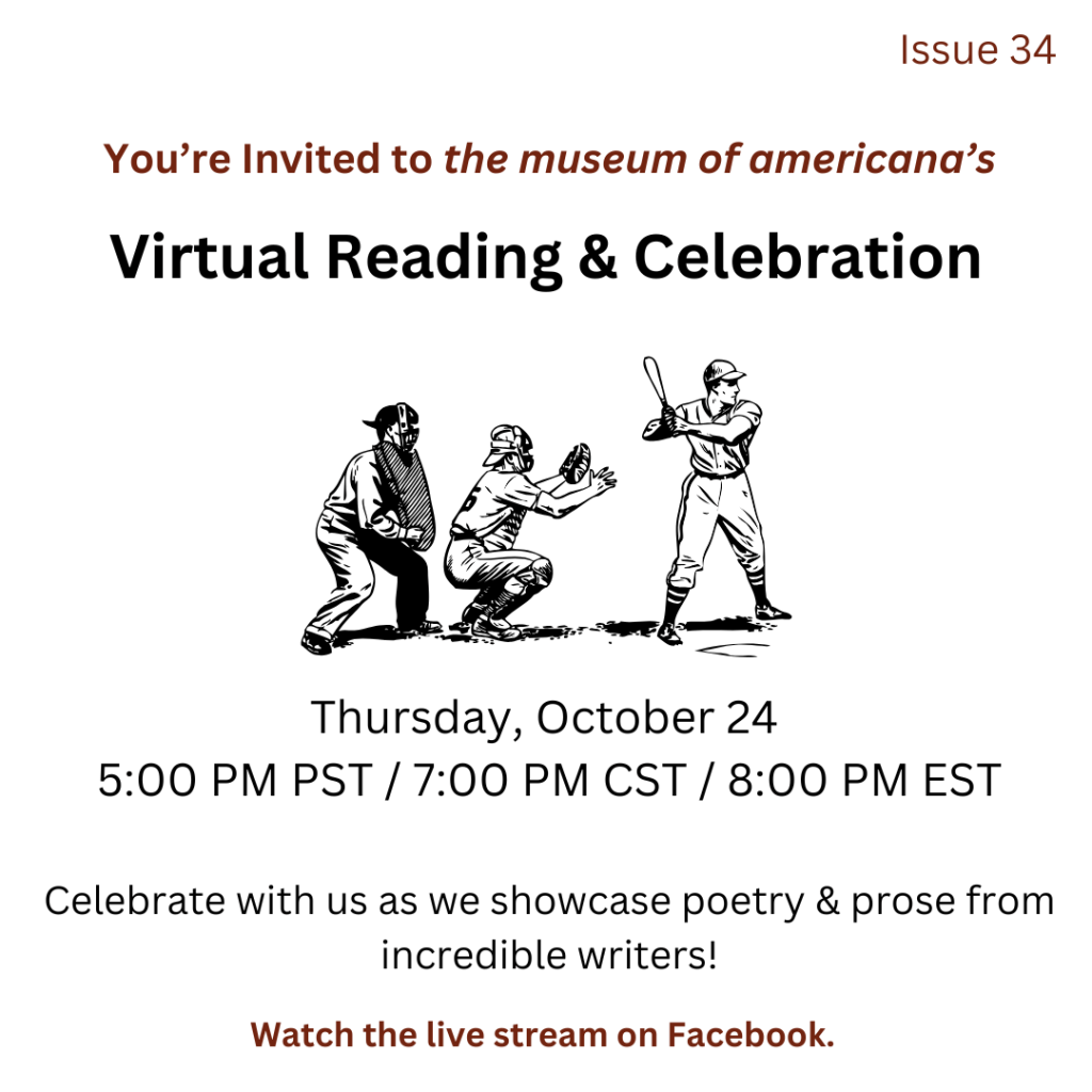 We’re thrilled to invite you to a special virtual celebration and reading hosted by the museum of americana on Thursday, October 24 at 5:00 PM PST / 7:00 PM CST / 8:00 PM EST. This event will feature contributors from our upcoming Issue 34, sharing their poetry and prose. Tune in live on our Facebook page to listen to these incredible voices.