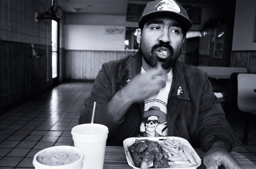“Autorretrato (eating at odyssey pizza in hopes that they don’t fall to gentrification)” is a self portrait I took while eating at Odyssey Pizza, one of my favorite spots in East Downtown Las Vegas. It’s a small business that has existed there since my childhood. My partner Sara, who helped me take this shot, introduced the hole-in-the-wall to me when we began dating 14 years ago and have not stopped going since then. We believe that eating there and supporting their business will help a bit while the gentrifying forces of downtown move east.