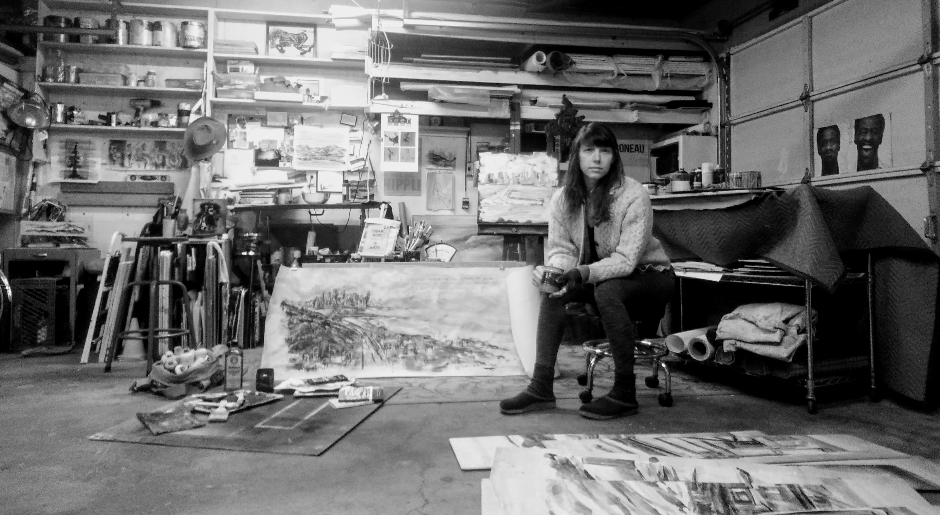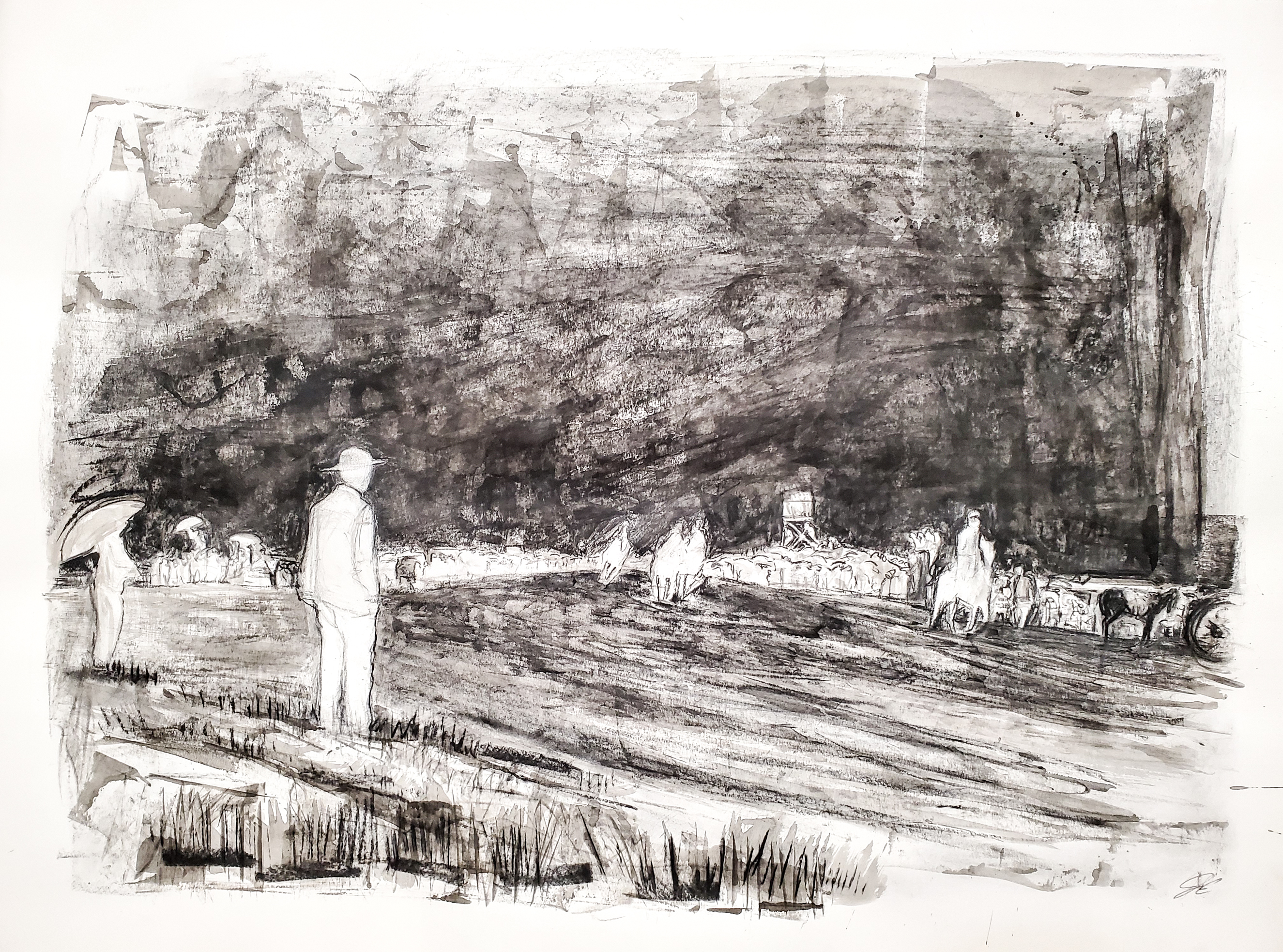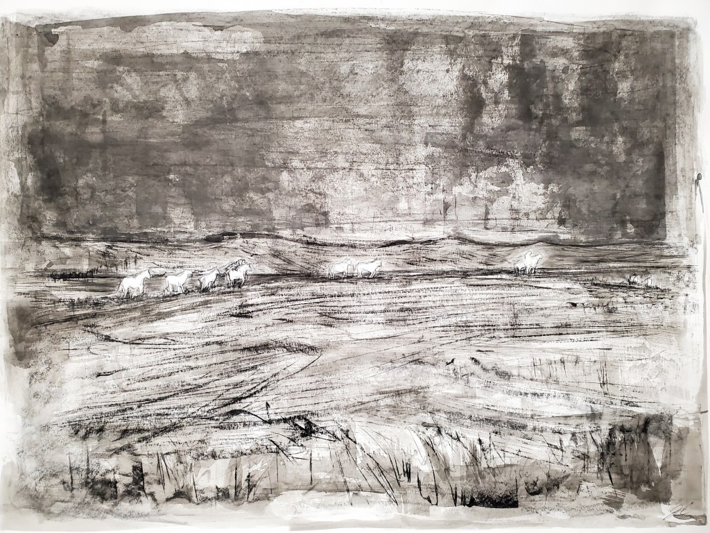 The vastness of desert and sky depicted in the scenes bring attention to the beauty found in open spaces; allowing for the artworks to reference the timelessness of Man’s attraction to the unknown. Viewers become reacquainted with historic images of the West while discovering the depth and movement that negative space can harness. The black and white contrast of the original photo negatives is mimicked with expressive ink and charcoal layering on white paper, giving more attention to the brushwork and linework rather than sole attention to the subject matter. The creation process also highlights original prose and haiku poetry, written by the artist, in the “memorandum” journal of which the photo negatives were found. All writing is intentionally detailed and spoken in reference from then(1900’s) to now. Each painting is titled from the writings.
