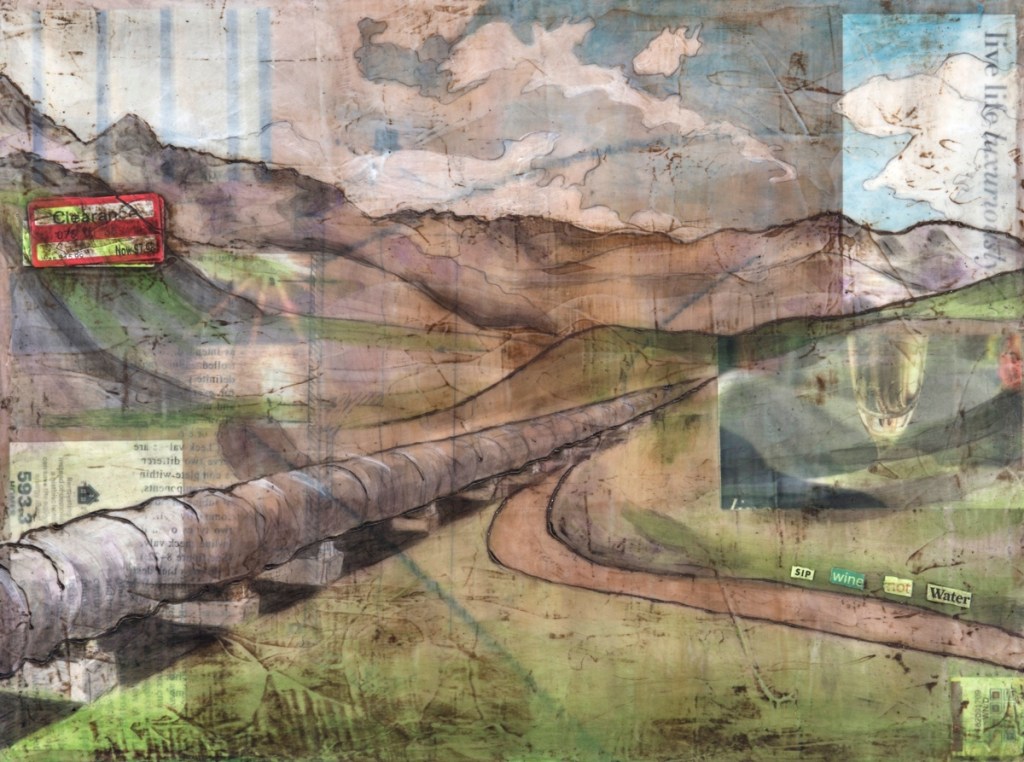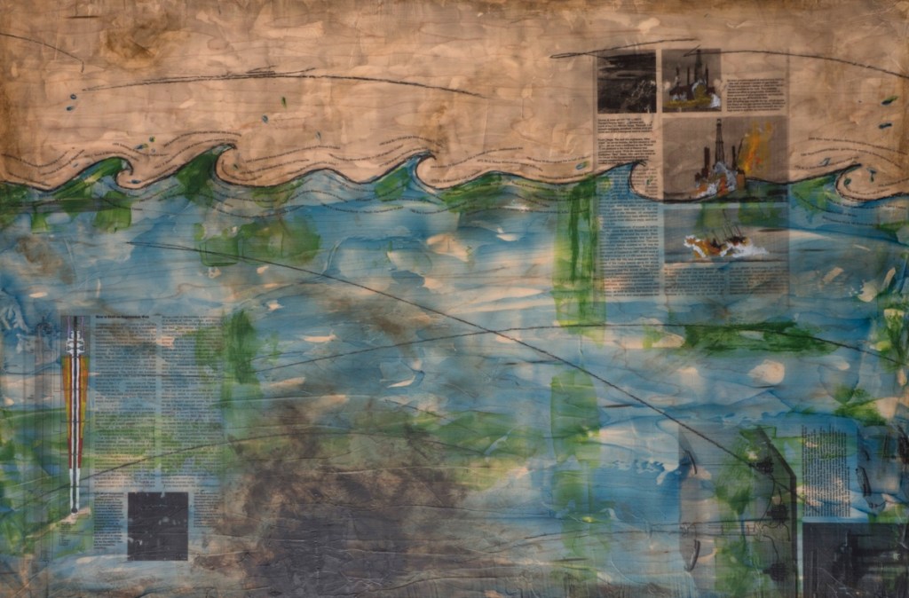 I work intently, building layer upon layer of images, text, visual information, found objects, and paint. Carefully selected images compose my work along with metal, wire, bits of plastic, mesh, tags, product packaging, and other castoff items from my collection of found materials.